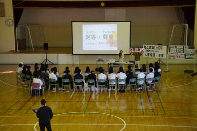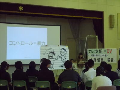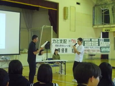 講座では、暴力の種類、同意の必要性、SNSとデートDV、ジェンダー規範等について教えていただきました。その中では、担任と生徒によるロールプレイもありました。