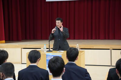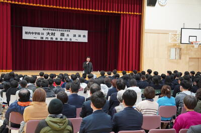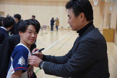 12月12日金曜日、新校舎落成記念事業で講演会を開催しました。稚内中学校の卒業生である大村巌様(現横浜DeNAベイスターズ野手コーチ/2026シーズン1軍打撃育成コーチ/元千葉ロッテマリーンズ選手)を講師としてお迎えし、自分の歩んできた道(人生)の中での経験談や思ったことをお話ししてくれました。中でも 「人生を歩んでいく上で大切なことは自分で決めることが大切。コツコツ続けることやあきらめない気持ちを心がけるときっと自分の夢につながっていく」というフレーズが子どもたちの心に刺さったようです。