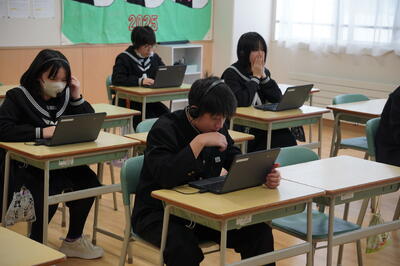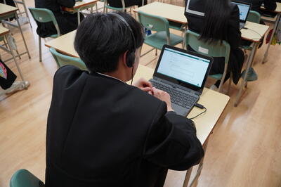 本日、来年度行われる全国学力・学習状況調査の英語の準備として、CBTシステムを用いた事前検証がありました。ヘッドセットを用いて、リスニングや実際に英語を話す練習を行いました。音声の指示に従い、答えるのは難しかったですが、次回はきっと完璧にできるはず!