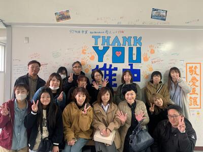 午後は1992年度卒業生たちが来校!稚中赴任時の2年生です笑。もう49歳!?みんな〇〇さん、〇〇さんになっていましたが、とても懐かしく卒業以来会った子がほとんどでした。校舎内を回って「いや~懐かしいわ!」という声。みんなで昔を思い出したのでしょう。帰り際に「落書きの壁」前で記念撮影。満足な様子で学校を後に。先生方皆さんでどうぞと、お茶を箱でいただきました!この場を借りて御礼申し上げます。ありがとうございました!