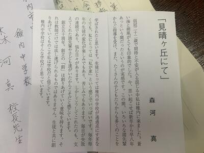 小林先生には、この「校長室の窓」を毎日楽しみに閲覧していただき激励をもらっていたこと、また本校生徒たちにも紹介し、何かを感じてほしいと思ったことが理由です。空の上から見守り、稚内中学校をこれからも応援してくれると思っています。