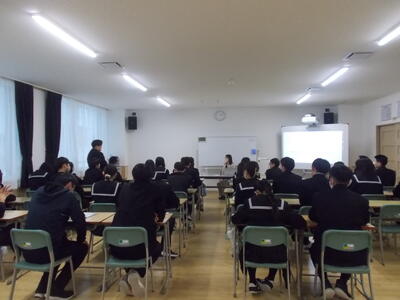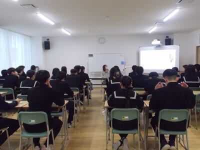 12月15日、3年生を対象に性に関する授業が行われました。旭川厚生病院 産婦人科医の酒井美穂先生をお迎えし、ご講話いただきました。授業では、妊娠や出産のこと、自分の身体を大切にすること、相手の気持ちを考えることなどについて、先生の体験談を交えながら分かりやすくお話ししてくださいました。